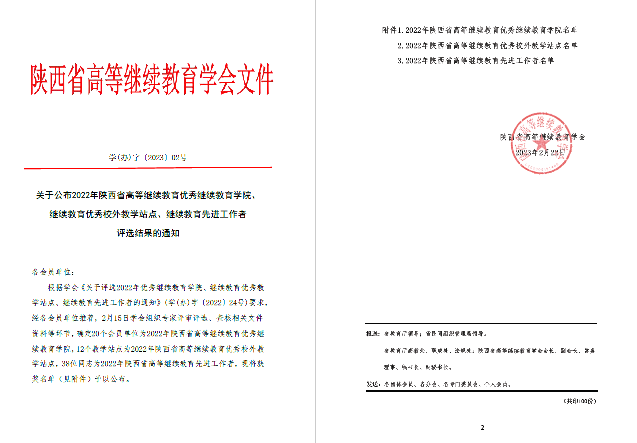 2023年2月23日,陕西省高等继续教育学会发布《关于公布2022年陕西省高等继续教育优秀pa电子官方网站、继续教育优秀校外教学点、继续教育先进工作者评选结果的通知》,pa电子pa电子官方网站荣获2022年陕西省高等继续教育优秀学院,惠震获2022年陕西省高等继续教育先进工作者。