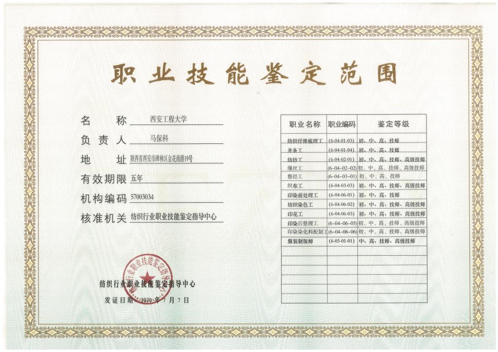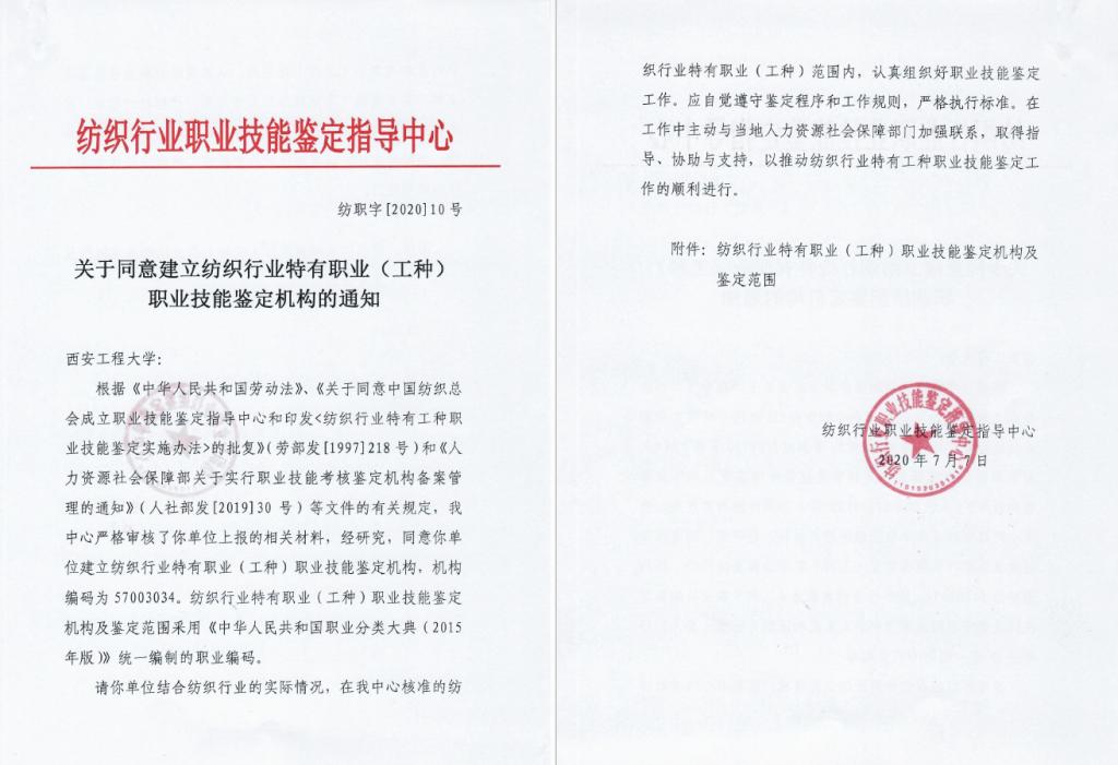 为切实加强pa电子继续教育人才培养与劳动就业的联系,推进校企合作、产学研结合,充分发挥学校继续教育服务地方经济社会的职能,全面提升纺织行业从业人员的综合素质、职业能力和社会竞争力,根据纺织行业职业技能鉴定指导中心《关于申请设立纺织行业职业技能鉴定机构的通知》(纺职字〔2019〕15号)以及《人力资源和社会保障部关于实行职业技能考核鉴定机构备案管理的通知》(人社部〔2019〕30号)文件精神,pa电子在充分调研的基础上,结合纺织服装行业的办学特色以及雄厚的师资力量,学校联合我省多家纺织企业,积极组织撰写申报材料,成功获批“纺织行业职业技能鉴定所”,开展陕西境内乃至西北地区纺织服装从业人员职业技能鉴定的组织、考试和协调管理工作。