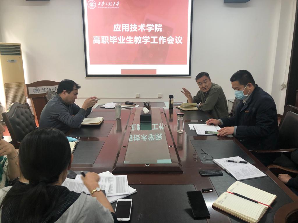 刘玉森首先传达了学校教务处〔2020〕17号文件“pa电子官方网站关于2020届本(专)科毕业生教学工作总体安排的通知”及学校其他相关文件精神。按照学校教务处通知,结合学校疫情防控工作的总体要求,根据学院高职教学工作的实际情况,对学院近期高职毕业生毕业设计、相关考试、高职专升本报名准备等工作进行了详细安排。一是毕业设计环节,继续按照学院本学期初制订上报的工作方案正常进行,学生返校后毕业设计指导工作由线上方式转变为线上线下相结合的方式,学院继续加强对毕业设计环节的督导与检查;二是毕业生补考和重修考试等均采取线上考核方式,以尽可能减少人员聚集,要求学院教务部门积极配合各任课教师把考务工作做细做实,确保线上考试顺利完成;三是提前做好高职专升本报名、资格审查与资格考试等前期相关准备工作;四是提前做好高职毕业生学历注册信息核对等相关准备工作;五是学院教务部门加强疫情防控期间的教学工作预案与相关准备工作,积极对接学校教务处相关部门和相关学院,认真做好各项教学服务工作,确保疫情防控期间学院高职教学各项工作顺利开展。
