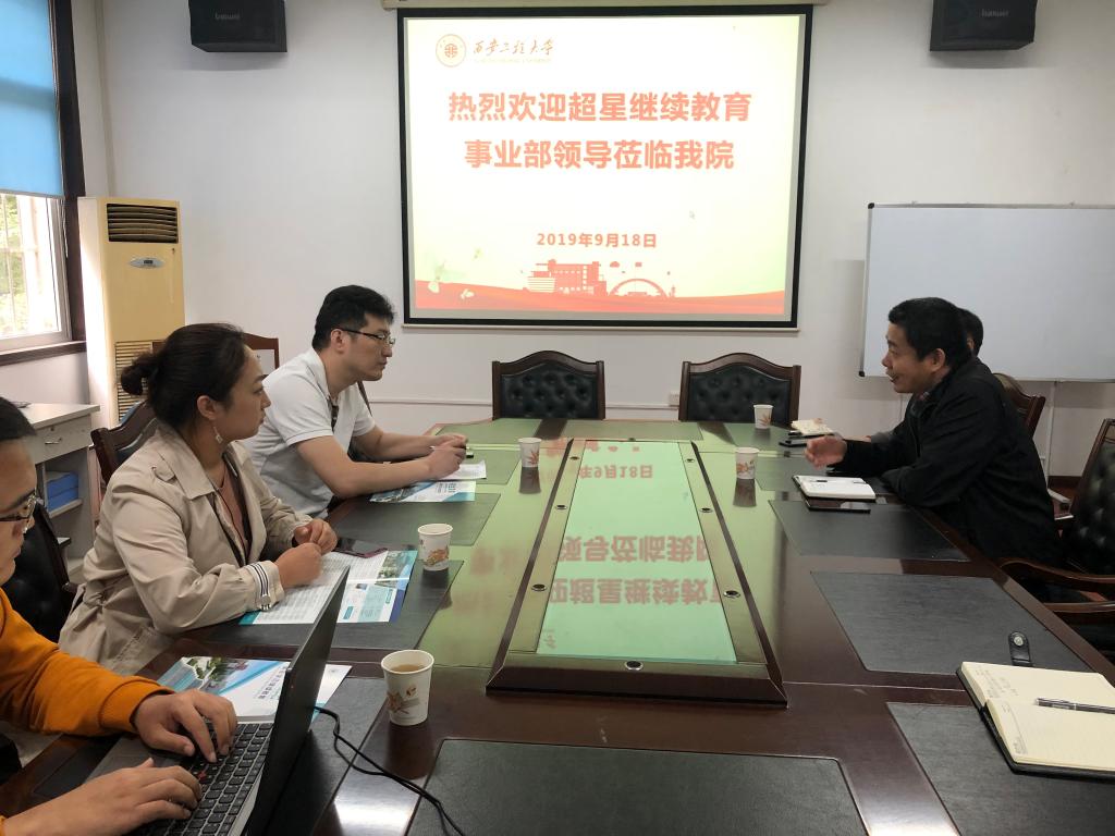 2019年9月18日下午,北京超星公司继续教育事业部副总经理马文华一行三人来pa电子商谈继续教育合作相关事宜。双方的合作交流座谈在学院会议室召开,学院副院长刘玉森、学院培训部、成人招生负责人等参加了此次座谈,座谈由刘玉森主持。