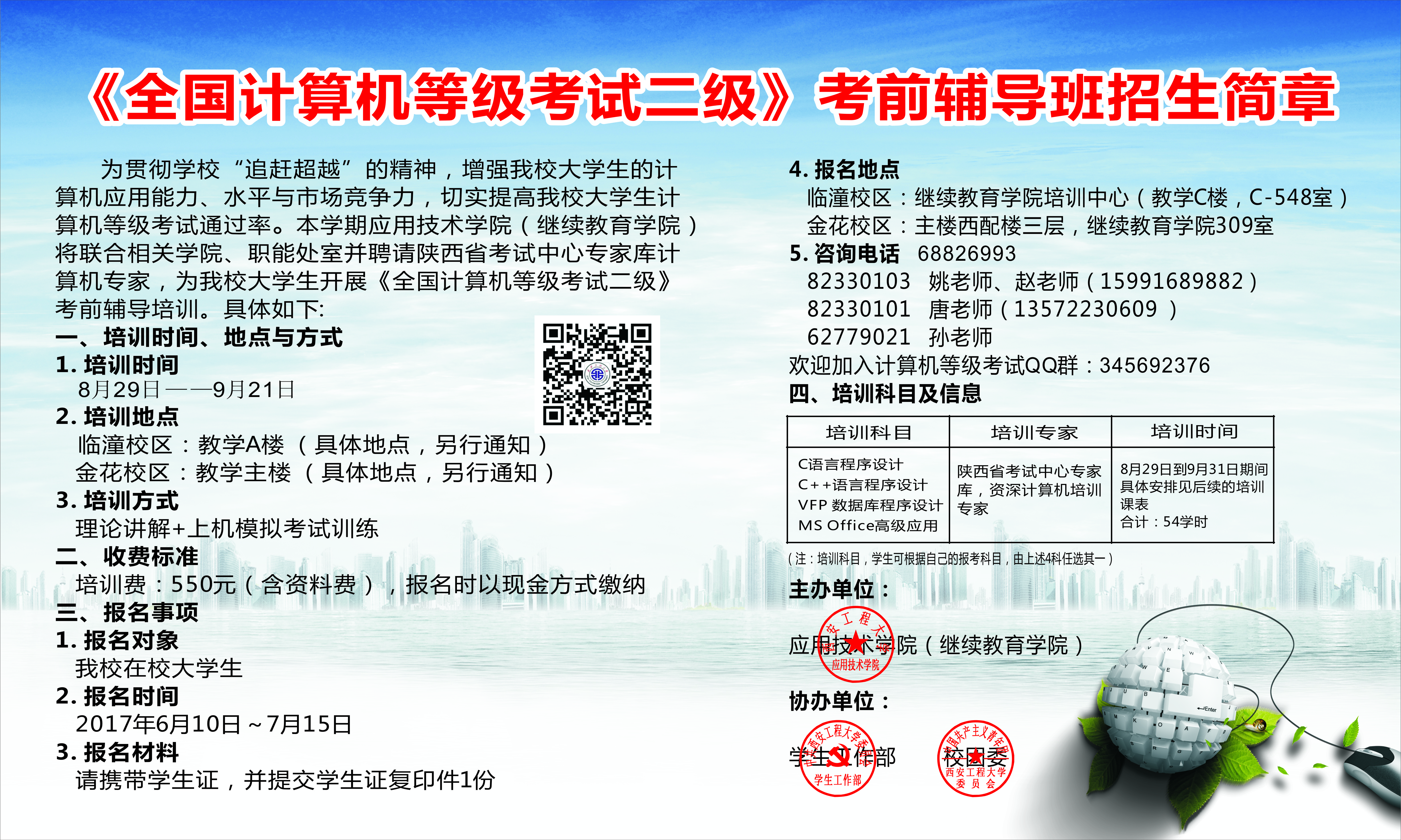 为贯彻学校“追赶超越”的精神,增强pa电子大学生的计算机应用能力、水平与市场竞争力,切实提高pa电子大学生计算机等级考试通过率。本学期pa电子官方网站(pa电子官方网站)将联合相关学院、职能处室并聘请陕西省考试中心专家库计算机专家,为pa电子大学生开展《全国计算机等级考试二级》考前辅导培训。具体如下